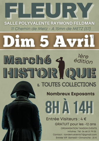 Ne manquez pas le 1er Marché Historique et Toutes Collections à la salle polyvalente Raymond Feldman de FLEURY (57- Moselle) le dimanche 5 Avril 2026 de 8h à 14h.