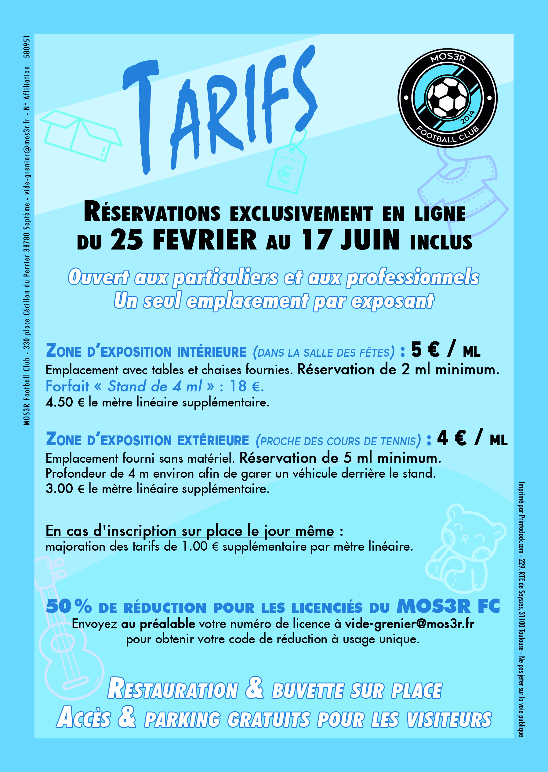 A l'issue de leur réservation en ligne, les inscrits recevront un mail de confirmation. Puis, au plus tard 1 semaine avant le vide-grenier MOnSt3Rueux, les exposants recevront un "laisser-passer" contenant toutes les informations nécessaires à leur installation et un bon pour 2 boissons chaudes (café ou thé) gratuites.