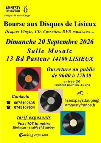 BOURSE AUX DISQUES Dimanche 20 septembre 2026 de 9h à 17h à Lisieux, salle Mosaic, 13 boulevard Pasteur 14100 Lisieux. Le groupe d’Amnesty Lisieux Pays d’Auge organise sa BOURSE AUX DISQUES vinyles, 33 tours, 45 tours, CD, cassettes, DVD musicaux … plus de 25 exposants, professionnels et particuliers. Café et boissons sur place. Tarif entrée : 2€, gratuit pour les -16 ans