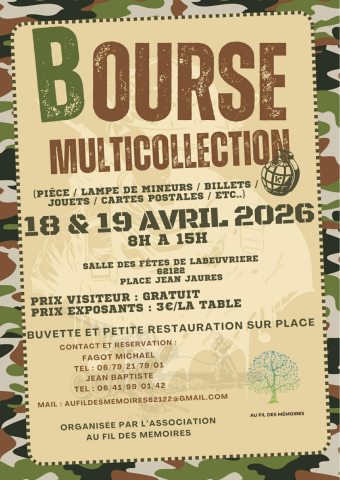 Organisation d'une bourse multi collection dans la salle des fêtes de Labeuvrière. Bourse sur 2 jours les 18 et 19 avril de 8h à 15h Buvette et petite restauration sur place
