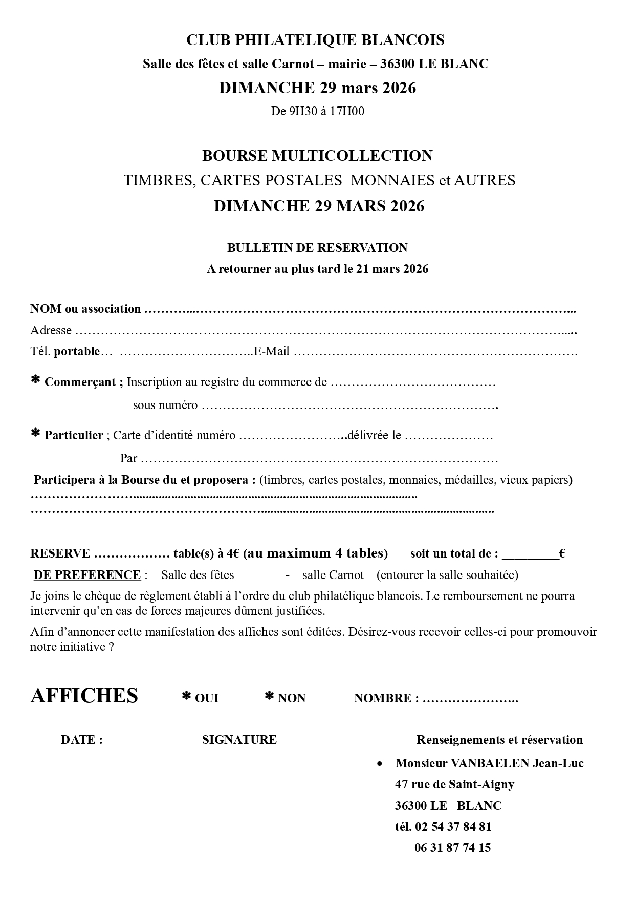 Le club philatélique blancois propose un bourse le DIMANCHE 29 MARS 2026 ouverte aux amateurs et professionnels. Y seront proposés timbres, cartes postales, monnaies, fèves et autres objets de collection. LIEU : salle des fêtes - place de la libération- 36300 LE BLANC
