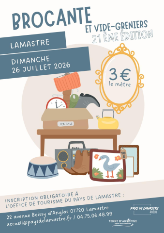 📣 Brocantes le Dimanche 26 juillet 2026 à Lamastre 07270  #AnnonceGratuite Objets d'occasion #Brocantes #LeChineur