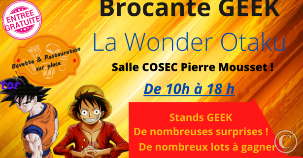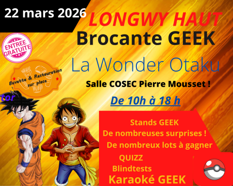 La Brocante GEEK La Wonder otaku revient pour sa 4ème édition le 22 mars à Longwy-haut (54400), à la salle COSEC Pierre Mousset. De 10 h à 18 h, venez dénicher des trésors GEEK de tous genres grâce aux stands variés présents ! De plus, de nombreuses animations tels que le corner Quiz/Blindtest, le groupe Resident Evil Cosplay, des décors immersifs et bien d'autres surprises … Des cadeaux à gagner au fil de la journée ! Restauration sur place, food truck thai et une super ambiance !