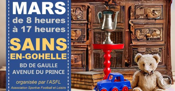 Brocante - Vide Grenier - Marché aux Puces organisé par l'ASFL le 7 mars 2026 dans le centre ville de Sains-en-Gohelle. Très réputé. Beaucoup d'exposants et de visiteurs.
