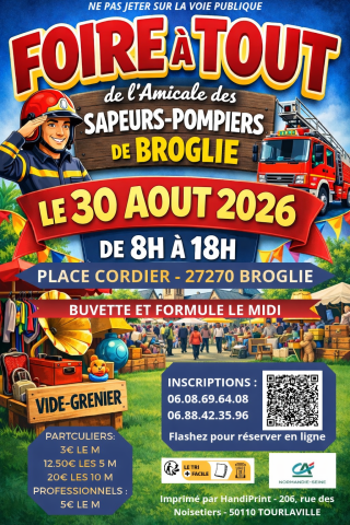 La foire à tout organisée par l'amicale des Sapeurs Pompiers de Broglie se déroulera place Cordier- 27270 Broglie