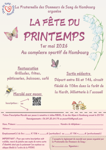 Nous vous attendons pour la traditionnelle fête du Printemps le 1er mai 2025 (marché aux puces, sortie pédestre et restauration). Comme chaque année, elle sera organisée par la Fraternelle des donneurs de sang de Hombourg. Trouvez l'ensemble des informations utiles dans le flyer ci-joint.
