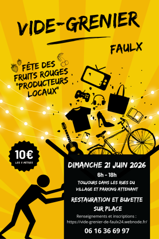Notre vide-grenier se tient le 21 juin 2026 à FAULX (54760) dans certaines rue du village (rue du stade, rue Maurice BARRES, rue du Bexot et rue du Chambré), la coulée verte et les parkings de l'école.