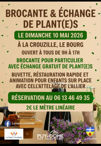 vide grenier /brocante avec échange de plants dimanche 10 mai à la Crouzille 63700 le bourg 2 euros le mètre linéaire. réservation au 06313464935