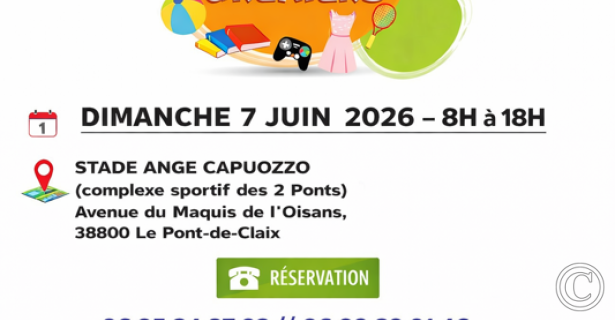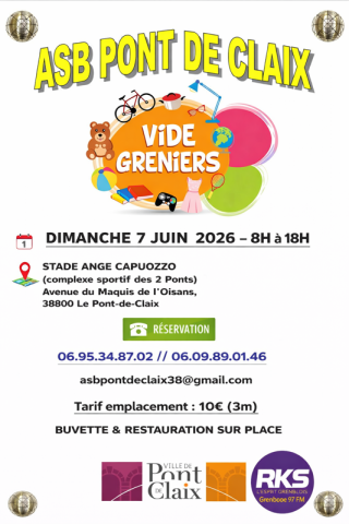 VIDE GRENIER ASB PONT DE CLAIX . inscription 10 euros le stand ( 3M) Cliquer pour voir l'adresse mail Renseignement 0695348702 ou 0609890146 Aprés le succès de notre première édition, Le vide- grenier de L'ASB de PONT DE CLAIX revient.