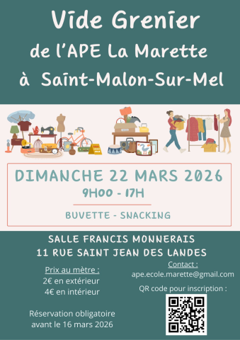 L'APE La Marette organise un vide grenier ainsi qu'une bourse aux vêtements 0-16ans à-50%. Cet événement est au profit du voyage scolaire des élèves de l'école.