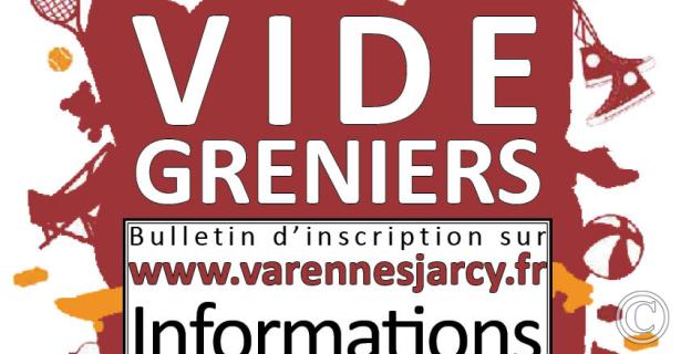2 eme Vide greniers communal de Varennes-jarcy situé sur la prairie en face du restaurant l'Olivier rue de la prairie ; INFORMATIONS en mairie au 01.69.00.11.33 ou à l'adresse mail Cliquer pour voir l'adresse mail. INSCRIPTIONS en mairie ou télécharger le bulletin d'inscription sur WWW.varennesjarcy.fr